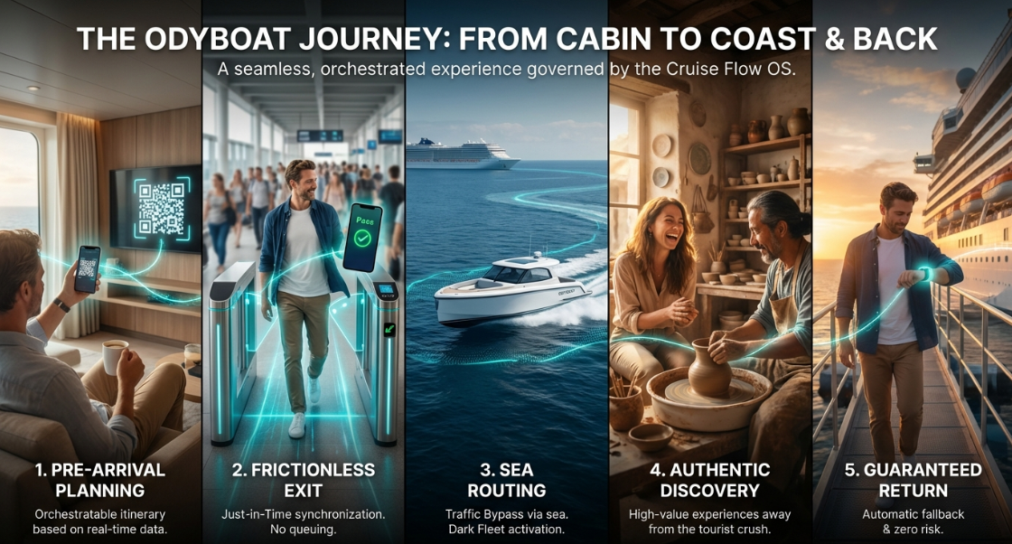Cruise Flow is the technological core of Odyboat. It is a digital orchestration platform designed to transform cruise passenger logistics from a bottleneck into a sustainable growth opportunity.